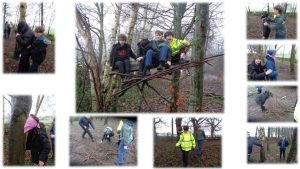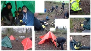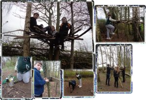 In Forest School this week, Mr. Woodward reports, ‘A cold, wet, woodland greeted the forest school group this week (as it seems to most weeks at the moment) but, undeterred by the conditions, the students threw themselves into the session with gusto. Strategy, teamwork, communication, patience and spatial awareness were all put to the test as the group took on a competitive challenge to remove sticks from a pile without disturbing any other branches. Next, an activity which took students out of their comfort zone as they were guided around the woodland by a partner whilst wearing a blindfold; as part of this challenge students were required to use senses other than their sight to identify a specific tree and it’s whereabouts in the woodland encouraging a more immersive sensory experience of the natural environment. Finally, teams were challenged to build the highest possible platform that they could, using material from the woodland environment and knot tying skills they had developed. Some very different approaches to the challenge ensued with Alfie, Tyler, Coby and Hugo emerging victorious.’